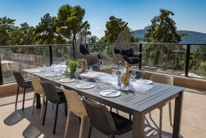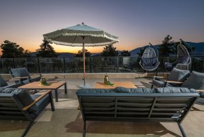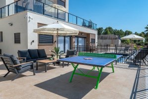 בחוץ תמצאו בריכת שחייה מחוממת ומגודרת, לצד עמדת מנגל BBQ, מיטות שיזוף ופינות ישיבה מרווחות. הפינות הירוקות כוללות גם שולחן גינה, ערסל ופינג פונג להנאה מושלמת תחת השמש.