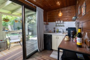 האבזור הקיים במטבח של בקתה בקצה ההר: קומקום חשמלי, מכונת אספרסו / קפה, מיקרוגל, מקרר.