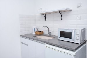 האבזור הקיים במטבח של חלון לנוף: קומקום חשמלי, כיריים, מיקרוגל, מקרר.